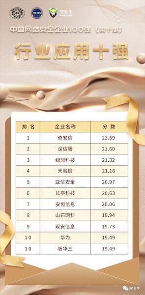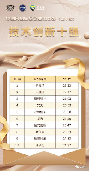中国计算机学会抗恶劣环境计算机专委会、信息产业信息安全测评中心、安全牛联合发起第十版《中国网络安全企业100强》综合能力100强(以下简称“100强”)调查和研究活动。2022年11月15日,基于对申报企业2021年度发展数据的收集、整理、核验与分析研究,第十版《中国网络安全企业100强》正式发布。