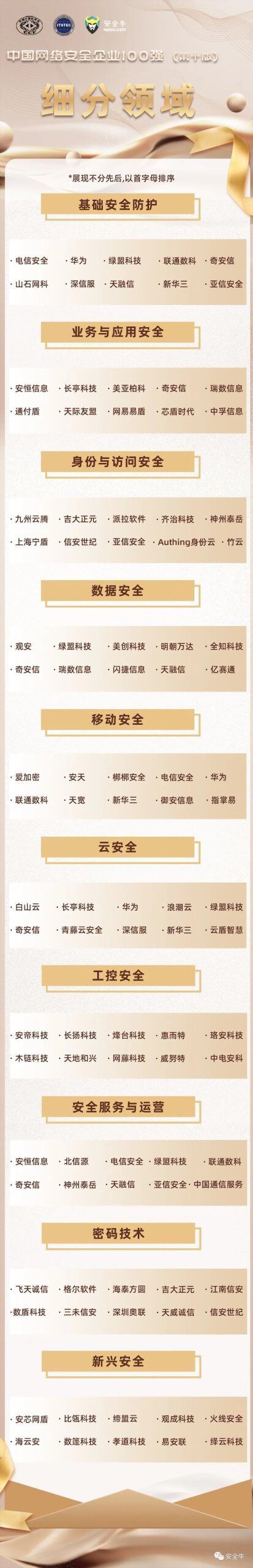 本次100强调研中,细分出基础安全防护、业务与应用安全、身份与访问安全、数据安全、移动安全、云安全、工控安全、安全运营与服务、商用密码、新兴安全十个领域,从营收占比、用户数量、产品成熟度等角度,对细分领域中有较突出特点的安全企业进行了收录推荐。
