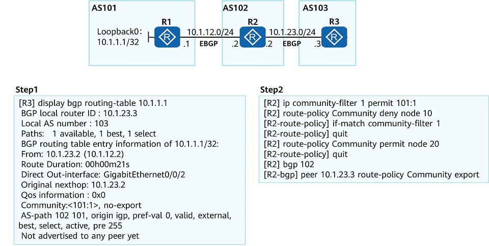 如图所示,AS101、AS102、AS103间通过BGP实现互通,其中R1与R2、R2与R3分别建立EBGP邻居关系。R1对10.1.1.1的路由添加团体属性<101:1>,R3对10.1.1.1的路由追加团体属性<no-export>,某工程师通过Step1查看R3关于路由10.1.1.1的表项,后来该工程师又在R2进行了Step2的相关配置,关于上述场景,以下描述正确的是?( )