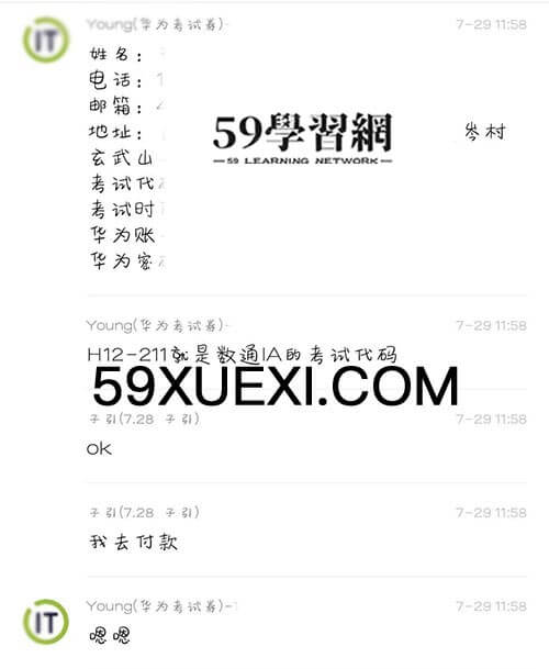 - 其次,确定考试信息(包括考试时间和地点),并通过59学习网代预约考试。在预约考试时,考生需要填写必要信息,包括姓名、电话、邮箱地址、考试代码、考试时间、华为账号和密码。